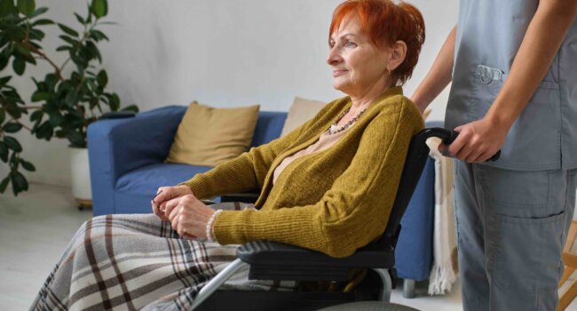 Elderly red hair woman covering with blanket using wheelchair with nurse walking behind her at hospital Approfondir l'accompagnement spécialisé : Formations pathologies et handicap Ces modules visent à vous outiller pour offrir un soutien plus éclairé, sécurisant et adapté, renforçant ainsi votre rôle essentiel auprès des personnes et de leur famille.