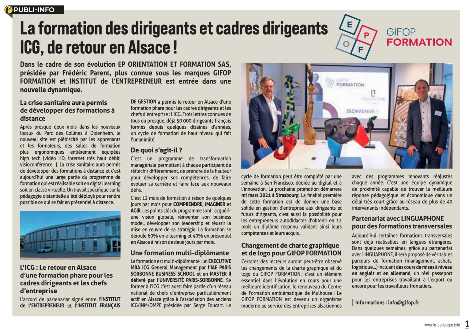 La formation des dirigeants et cadres dirigeants ICG est de retour en Alsace grâce au partenariat entre l’INSTITUT de l’ENTREPRENEUR et l’INSTITUT FRANÇAIS de GESTION. l’IFG est une formation solide, réputée sanctionnée par un MBA de l’IAE de Paris et un Master II de l’Université Paris-Sorbonne.